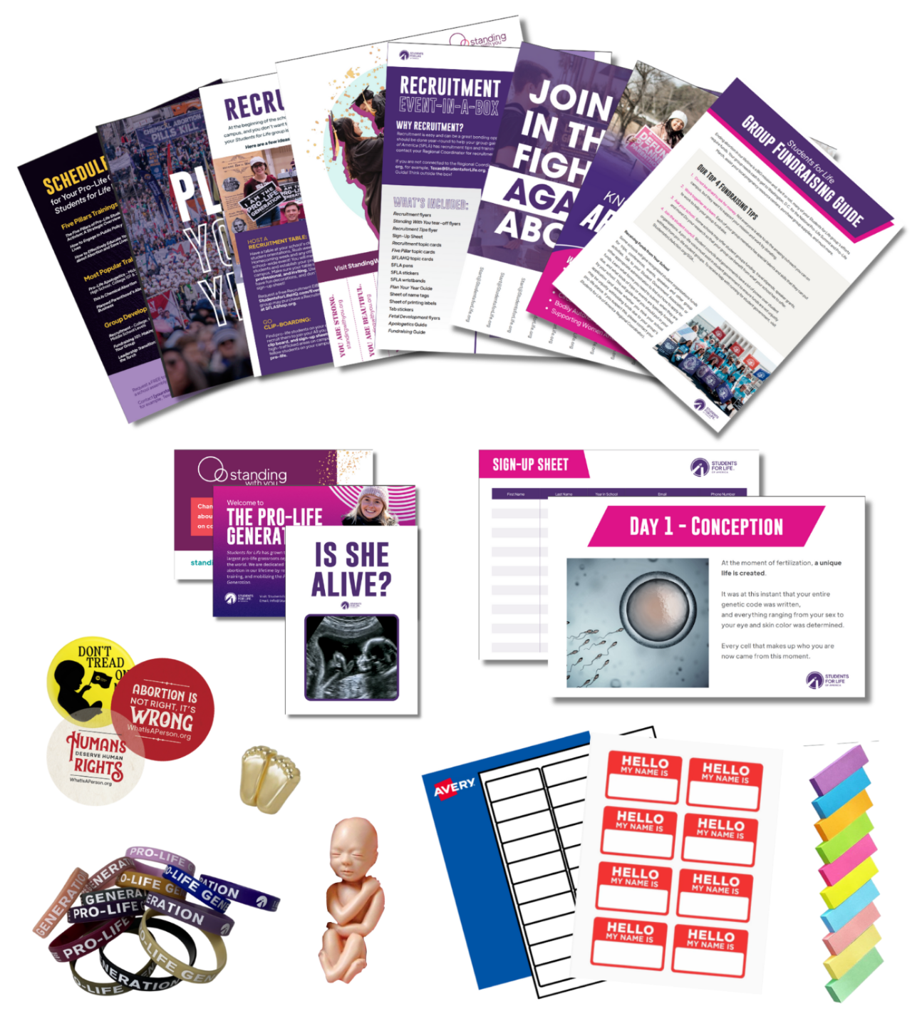What: Sign-up sheets, apologetics guide, fundraising guide, sample flyers, assorted topic cards, SFLA pens, buttons, stickers, wristbands, a Plan Your Year Guide, name tags, fetal models, access to a Recruitment Tabletop, and more!