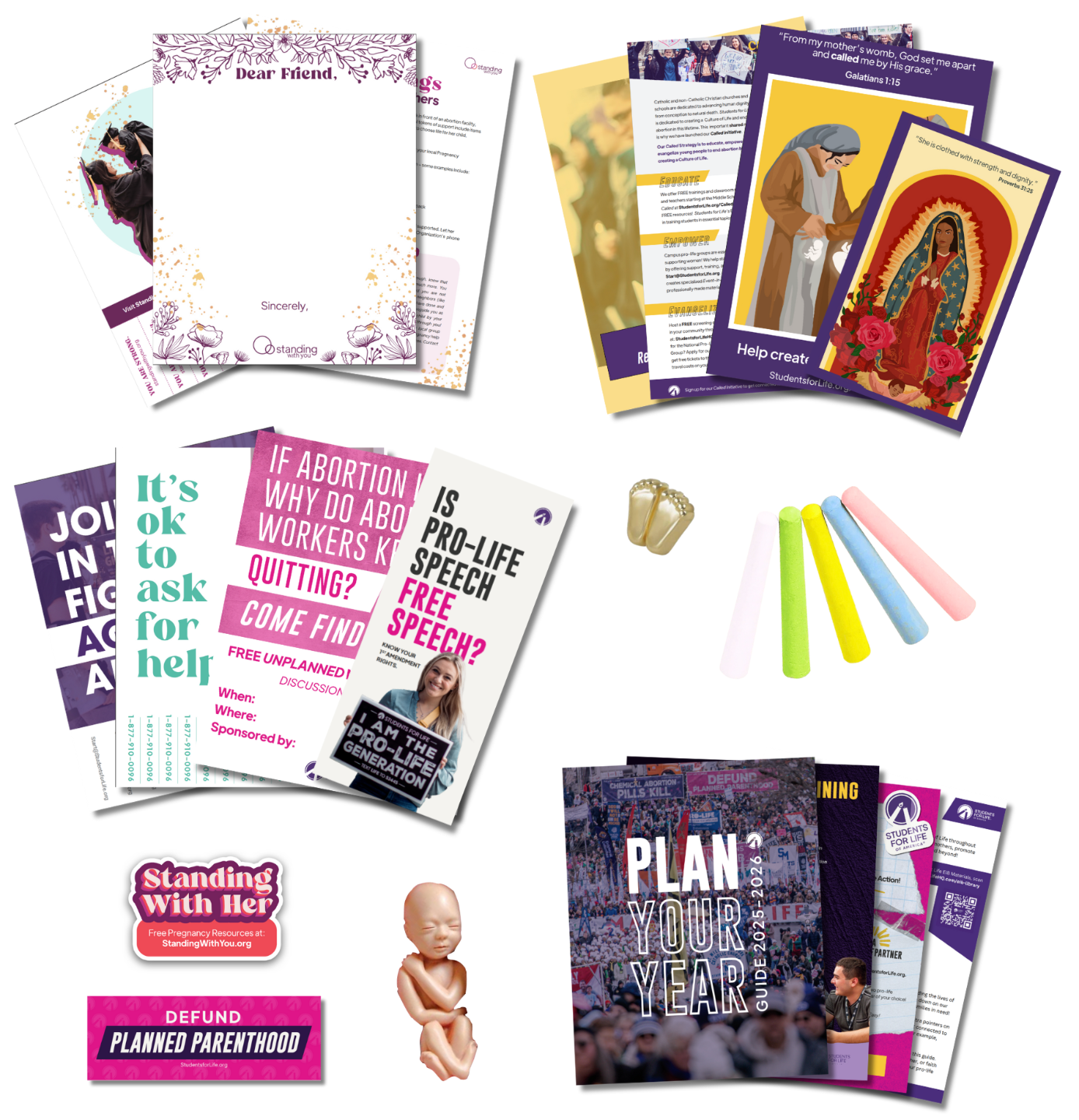 What: Flyers, Our Lady of Guadalupe prayer cards, Unplanned promotional materials and screening guide, a free Unplanned license, "Dear Friend" letters, a prayer vigil guide, a Plan Your Year Guide, fetal models, stickers, baby feet pins, chalk, and more!