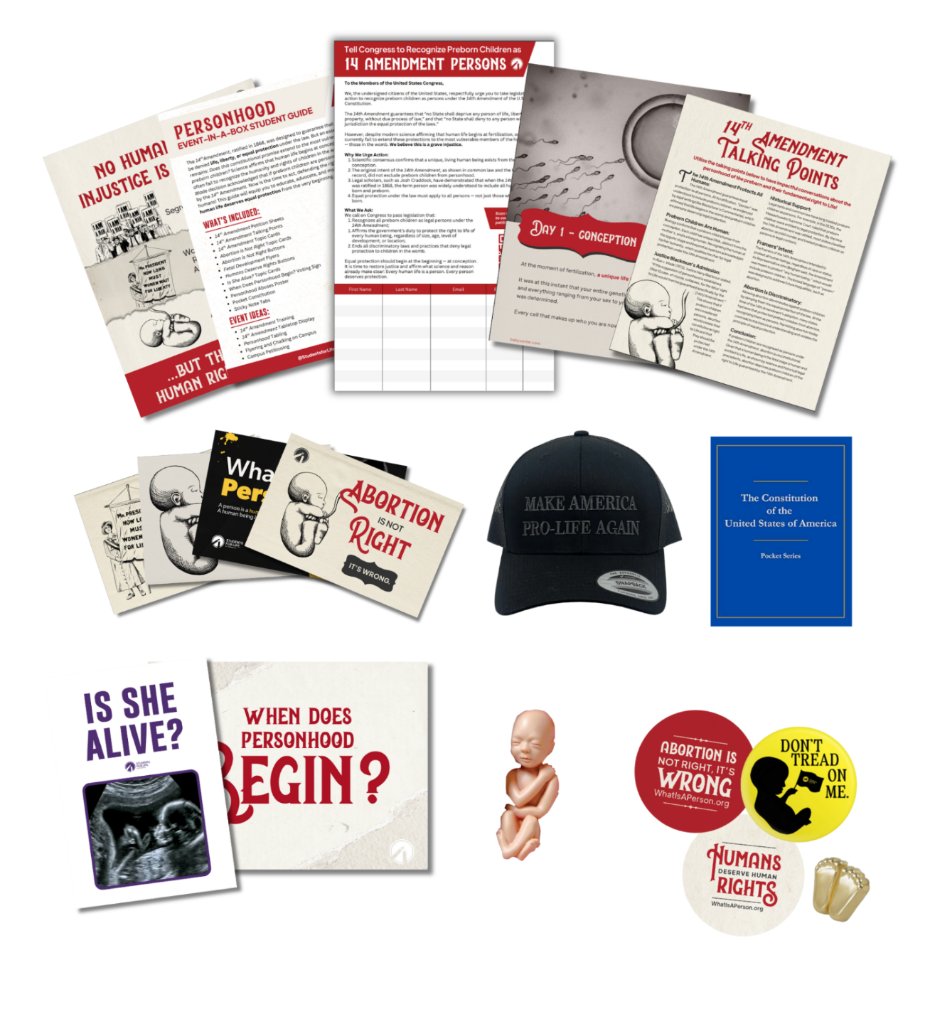 What: Fetal Development flyers, 14th Amendment talking points, petition sheets, assorted topic cards, stickers, buttons, pocket constitution, Make America Pro-Life Again hat, When Does Personhood Begin? sign, and more!