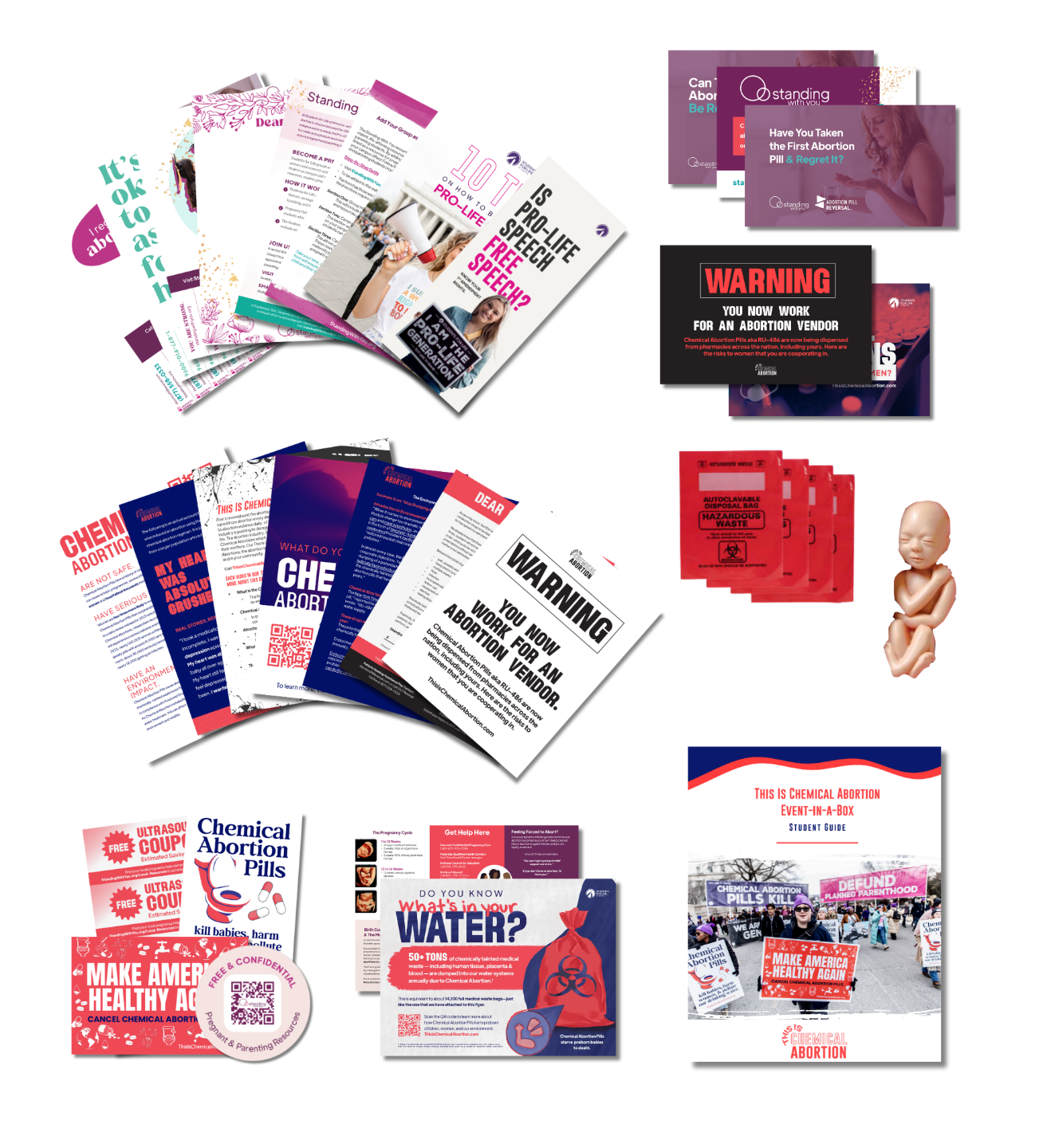 What: Flyers, This Is Chemical Abortion Docuseries screening guide and materials, "Dear Friend" letters, Marketing Partnership guide, assorted topic cards, stickers, red medical waste bags, fetal models, and more!