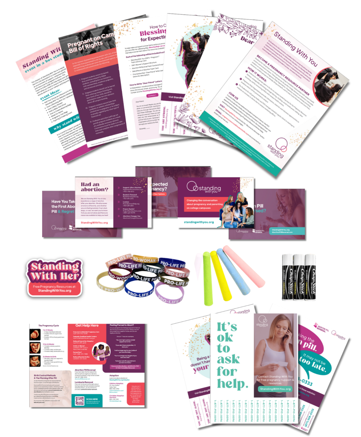 What: Flyers, Marketing Partnership guide, assorted topic cards, Standing With You resources, event guides, Blessing Bag materials, stickers, wristbands, chalk, and more!