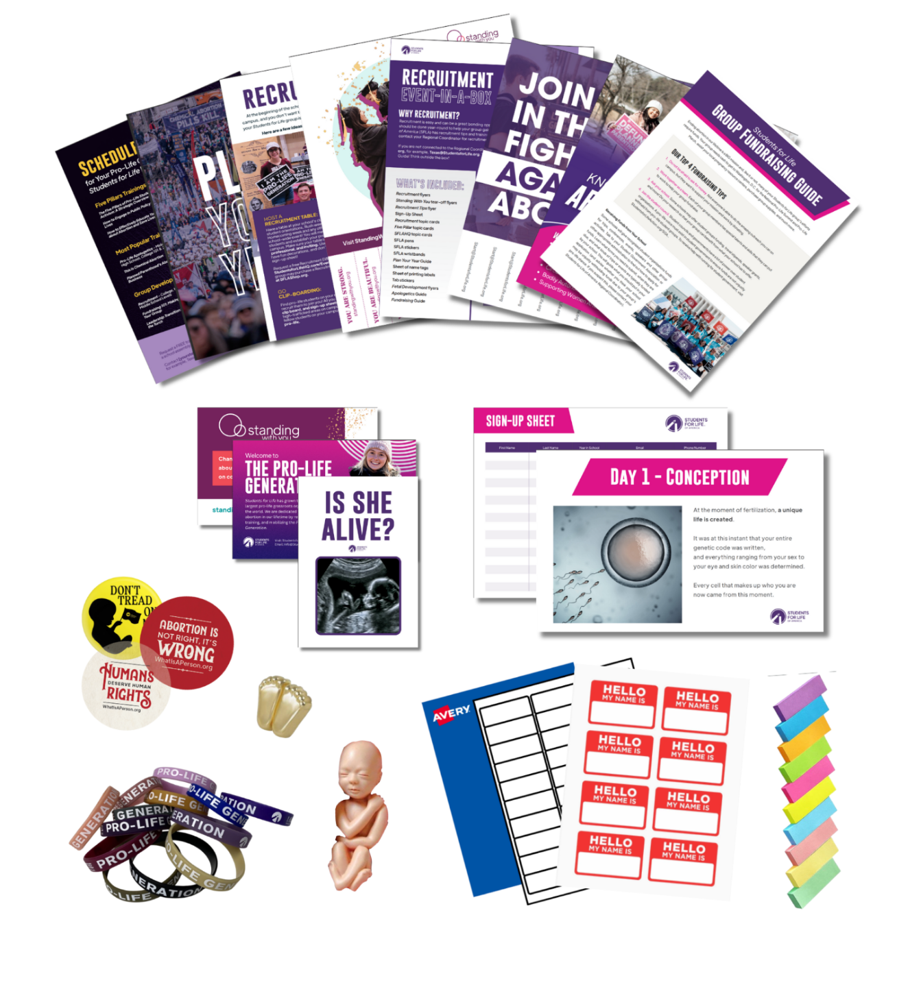 What: Sign-up sheets, apologetics guide, fundraising guide, sample flyers, assorted topic cards, SFLA pens, buttons, stickers, wristbands, a Plan Your Year Guide, name tags, fetal models, access to a Recruitment Tabletop, and more!
