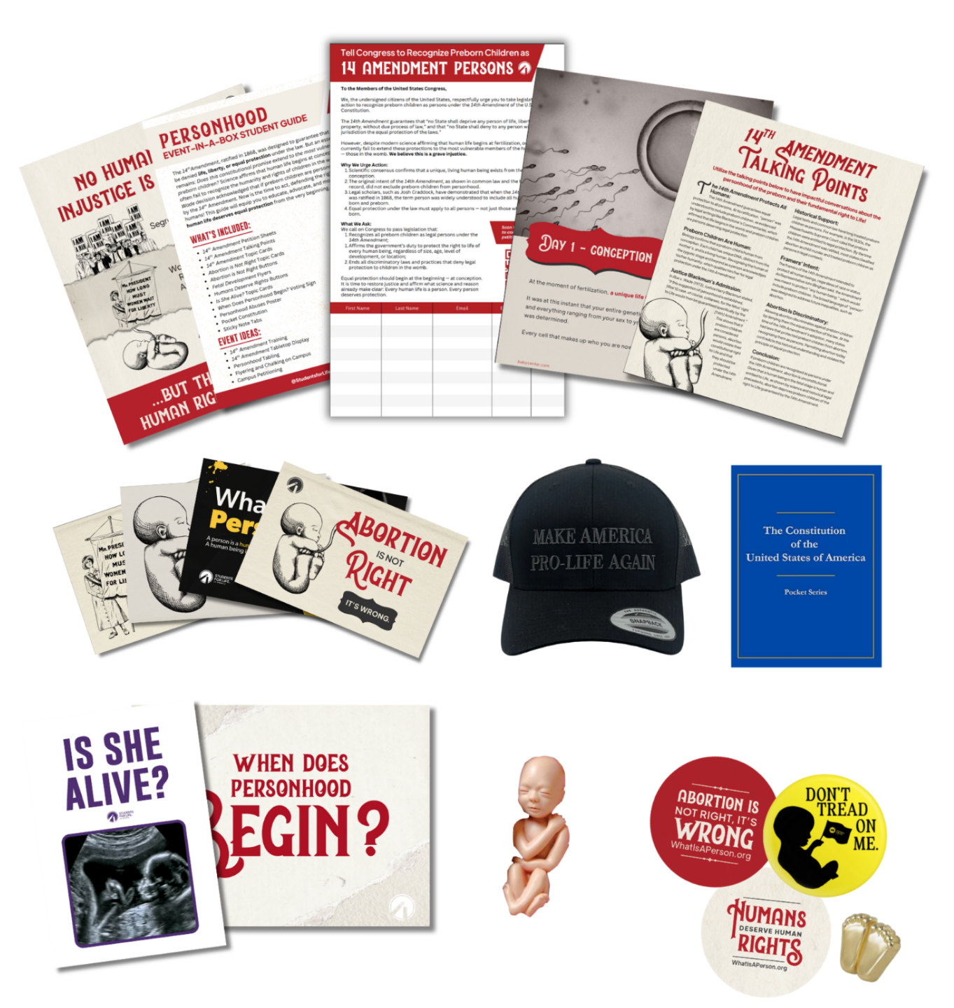 What: Fetal Development flyers, 14th Amendment talking points, petition sheets, assorted topic cards, stickers, buttons, pocket constitution, Make America Pro-Life Again hat, When Does Personhood Begin? sign, and more!
