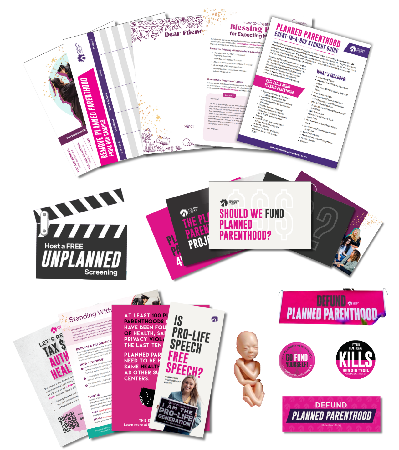 What: Flyers, Standing With You resources, Unplanned promotional materials and screening guide, a free Unplanned license, assorted topic cards, fetal models, SFLA pens, stickers, buttons, and more!