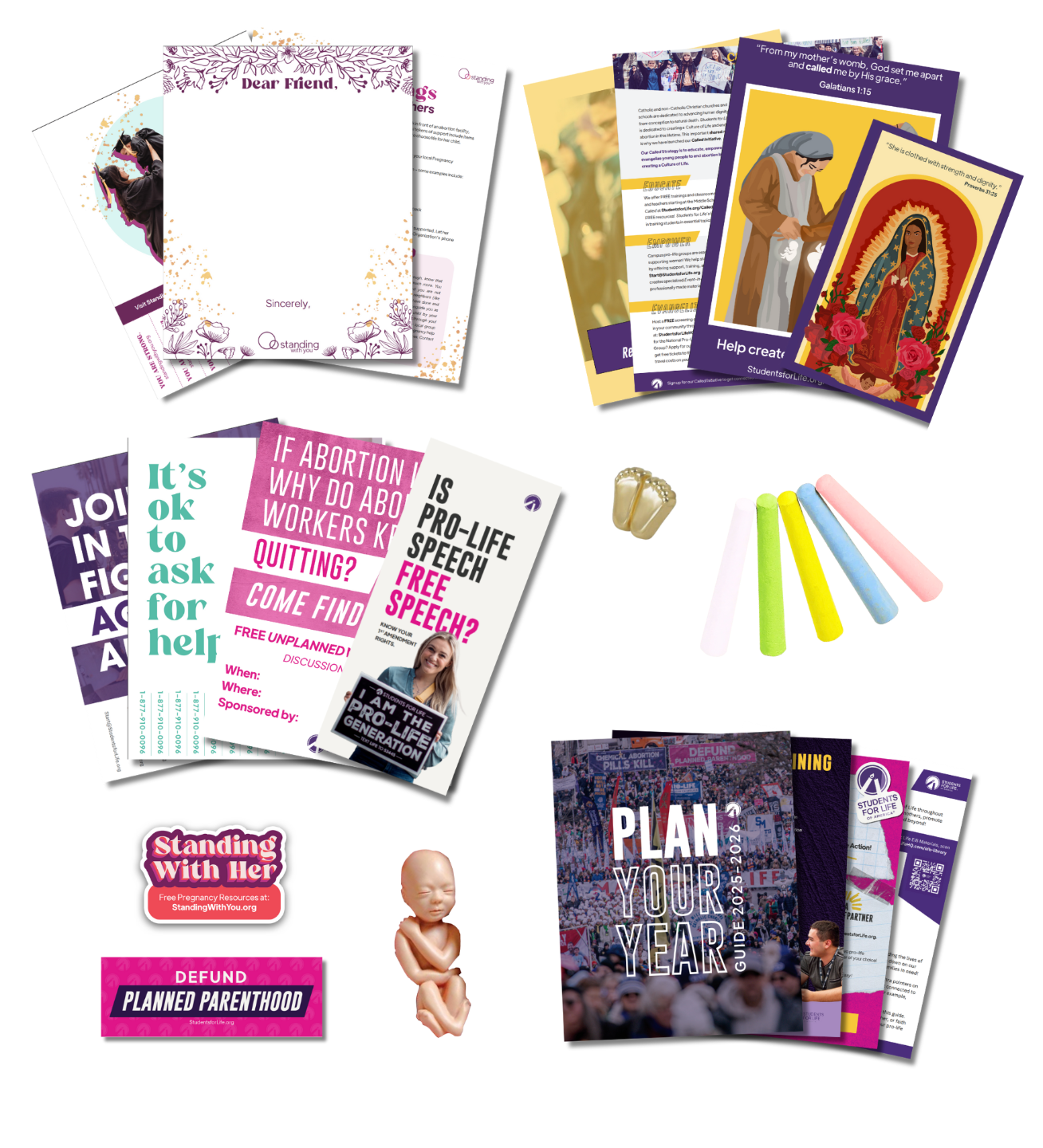 What: Flyers, Our Lady of Guadalupe prayer cards, Unplanned promotional materials and screening guide, a free Unplanned license, "Dear Friend" letters, a prayer vigil guide, a Plan Your Year Guide, fetal models, stickers, baby feet pins, chalk, and more!